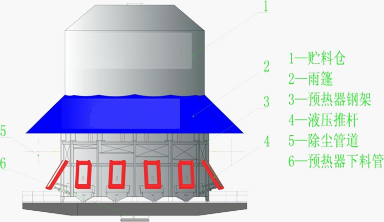 主要包括上部料倉(cāng)、下料溜槽、料倉(cāng)支架及結(jié)構(gòu)。保證在向預(yù)熱器本體內(nèi)給料時(shí)實(shí)現(xiàn)安全密閉,這樣外界的冷空氣不能進(jìn)入到預(yù)熱器內(nèi),并且供料可以借助棒條閥實(shí)現(xiàn)連續(xù)或間斷給料。