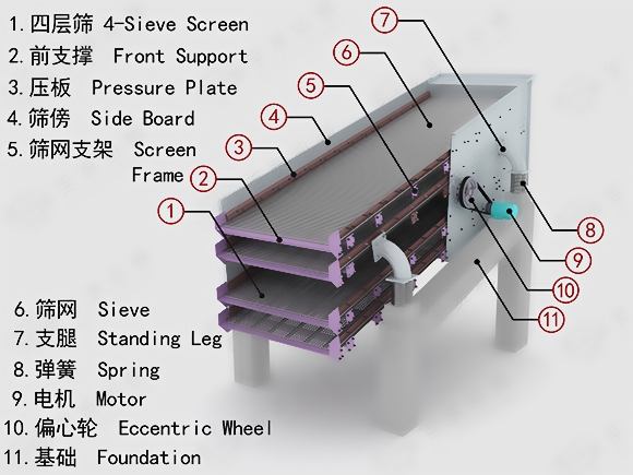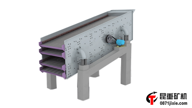 圓振動篩工作時,電動機經傳動器使激振器偏心塊產生高速旋轉。運轉的偏心塊產生很大的離心力,激發篩箱產生一定振幅的圓運動,篩上物料在傾斜的篩面上受到篩箱傳給的沖量而產生連續的拋擲運動,物料與篩面相遇的過程中使小于篩孔的顆粒透篩,從而實現分級。